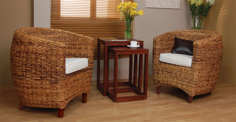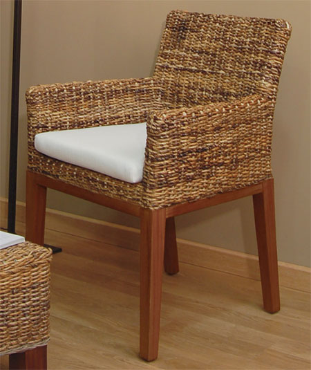 Hoy en día el desconocimiento de los materiales, no lleva a decir que todos los sillones de fibra vegetal son de mimbre, y nada mas lejos de la realidad, en verdad casi ninguno, es de mimbre, el mimbre es una fibra que se cría en España sobre todo en la parte de Cuenca y se trabajaba en varias comunidades predominando últimamente la zona de Salamanca, hasta la llegada de los productos de Asia, en ese momento desaparecieron casi todas los fabricantes de este material, la introducción de estos modelos nuevos trajeron también nuevas fibras vegetales entre ellas se encuentra, el rattan, la medula, el abacá, el jacinto y el manao, el rattan y manao es resistente al exterior y se emplea en decoraciones de jardines y terrazas, la abacá y medula son para la decoración interior, su formas son muy variadas y cuentan gran variedad de sillones, sillas y sofás, su acabado permiten introducirlos en cualquier decoración dando un toque diferente, os adjuntamos una serie de imágenes de diferentes sillones.
