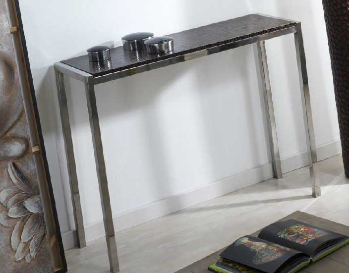Hoy en este post queremos destacar la amplia colección de consolas para el recibidor en aluminio y acero con diferentes acabados en la parte superior, esta seleccion esta fabricada con tubos de acero y aluminio cromados en color plata brillante, en su parte superior disponemos de acabados en madera, nácar, poli piel y cristal, esta serie que os presentamos es ideal como entrada  recibidor de pequeñas dimensiones, su aspecto lineal y sobrio da una ligereza visual al entorno de nuestro recibidor, os adjuntamos 6 imágenes de diferentes modelos, si queréis mas información visitar nuestra tienda de muebles online artesaniadecoracion.com.