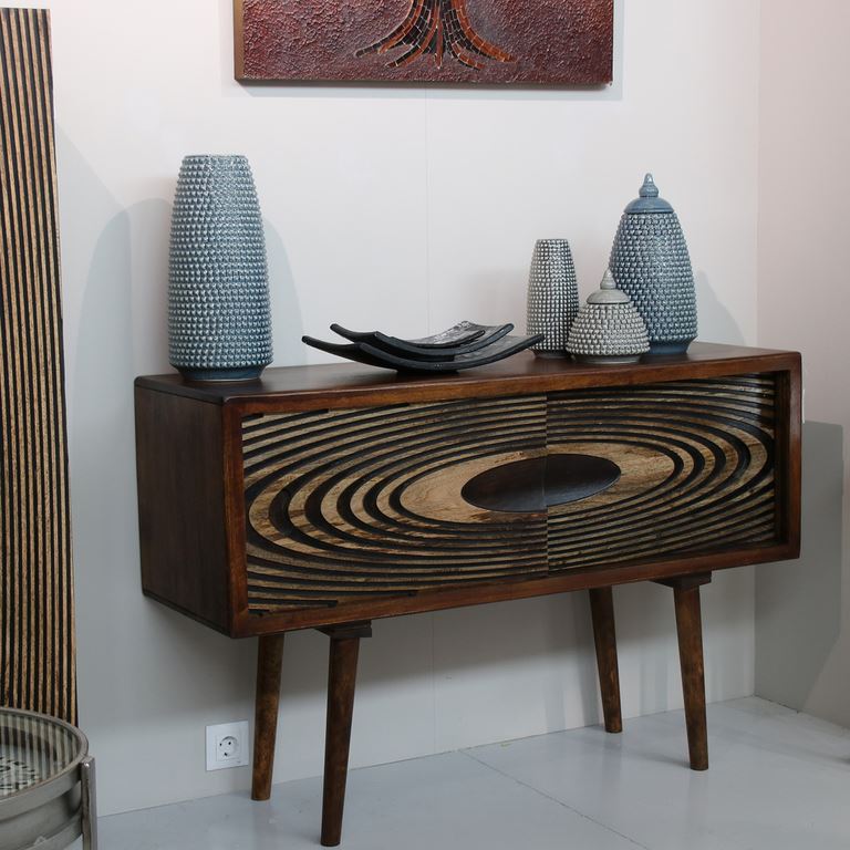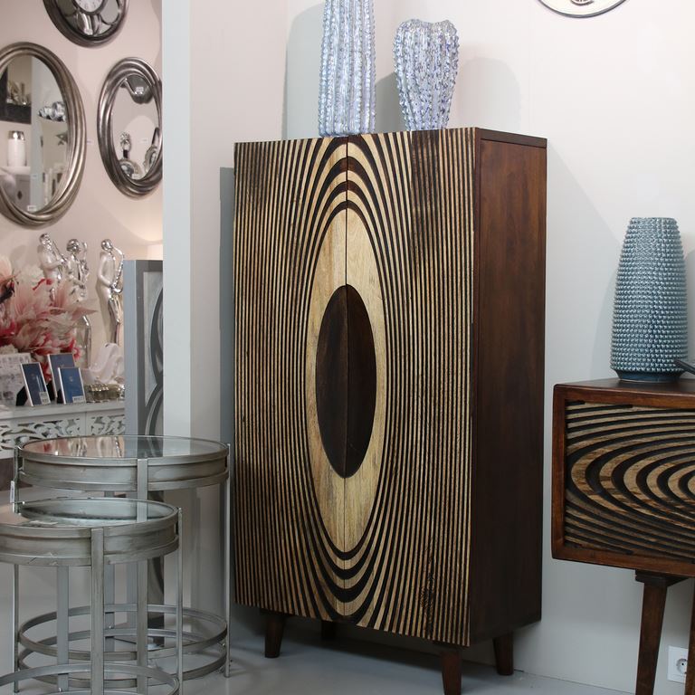 En el post de esta semana os queremos presentar dos colecciones de mobiliario con estilo Étnico, la colección Étnica Albalanda que dispone de un aparador, consola y un armario con 2 puertas, se fabrica en madera maciza de mango natural con acabado en nogal avellana, las puertas se terminan con un tallado en ondas bicolor madera natural y nogal, la segunda colección es la serie Barisala, esta dispone de un armario botellero para salón y armario vitrina y un aparador puertas correderas, se fabrica en madera maciza de mango natural con acabado en nogal oscuro, en una de las puertas que disponen los armarios y el aparador se talla una figuras geométricas con terminación en colores, os adjuntamos los 5 modelos de esta colección Étnica, para más información visitar nuestra tienda de muebles online artesaniadecoracion.com.