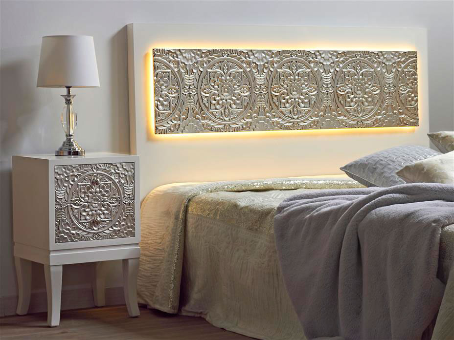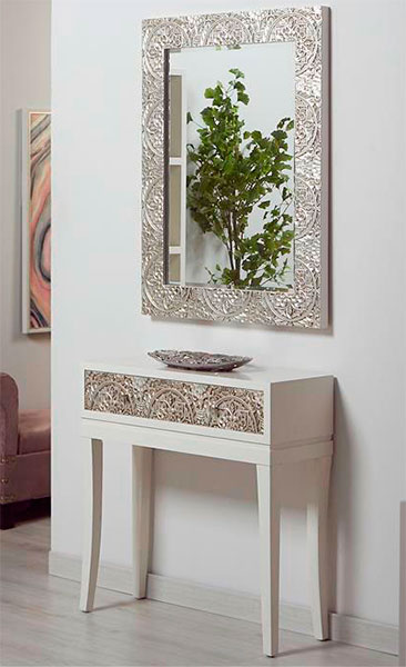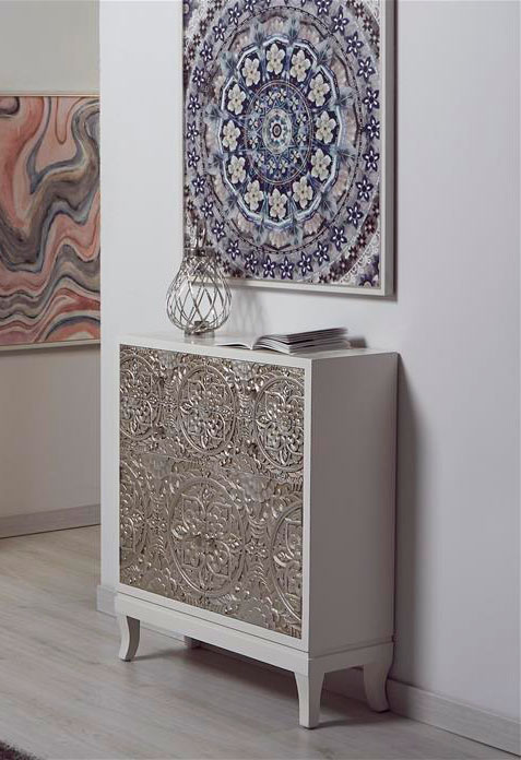 MUEBLES AUXILIARES EN BLANCO Y PLATA TALLADA ACTUAL KENDRA