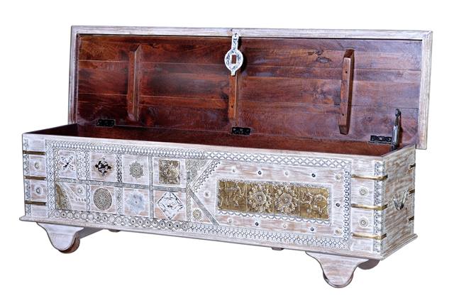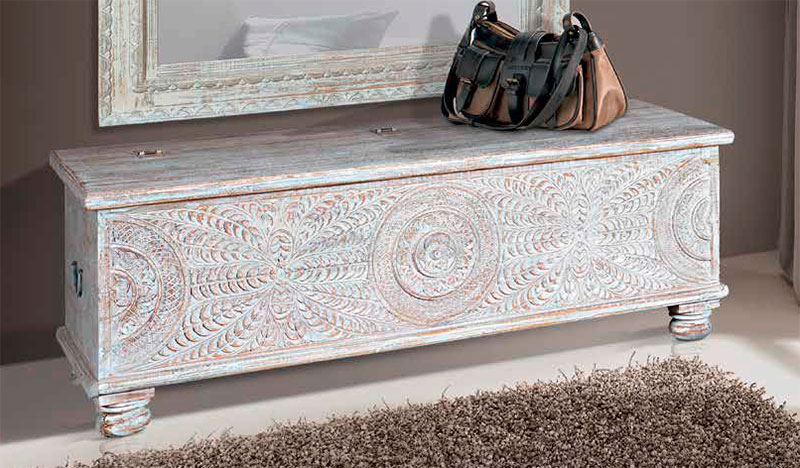 De nuestra sección de baúles y arcones, esta semana os presentamos la nueva colección de baúles y arcones serie Abalar, esta línea consta de 9 modelos de baúles que se fabrican en madera de mango maciza con acabados tallados en blanco decapado, la decoración esta echa con detalles en láminas de latón color bronce e interiores están terminados en barnizado color nogal claro, en esta serie contamos con diferentes tamaños y modelos con y sin ruedas, al final de este post os adjuntamos las imágenes de 6 modelos, para más información podéis seguir los enlaces que aparecen al pie de cada una de las imágenes, recordar que en nuestros precios está incluido el IVA y los gastos de envió.