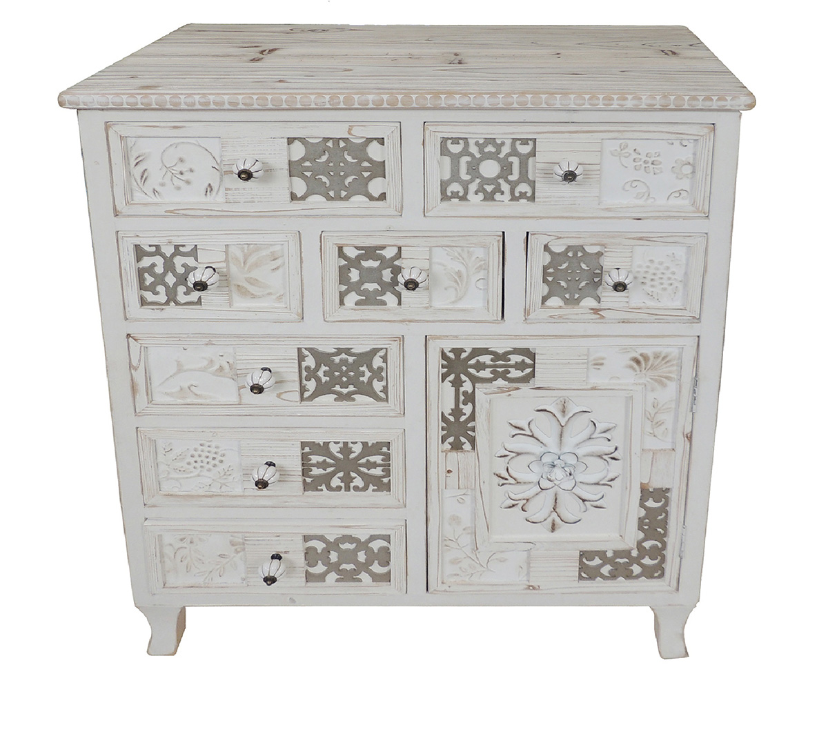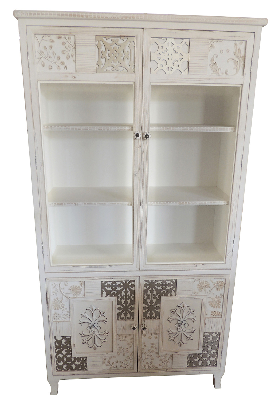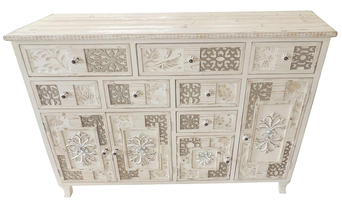Para el post de hoy, os presentamos la ampliación de catálogo perteneciente a la serie Angaran, esta nueva entrada nos amplía la colección incluyendo nuevas estantería librerías, vitrinas, aparadores, mesas de centro y mueble auxiliar, se fabrican con armazón en madera de pino combinado con fdm, para su acabado se aplica un blanco decapado, los cajones y puertas están decorados con trozos de metal incrustado, os adjuntamos 6 modelos en imágenes de las nuevas incorporaciones, para más información seguir los enlaces al pie de cada una de las imágenes.