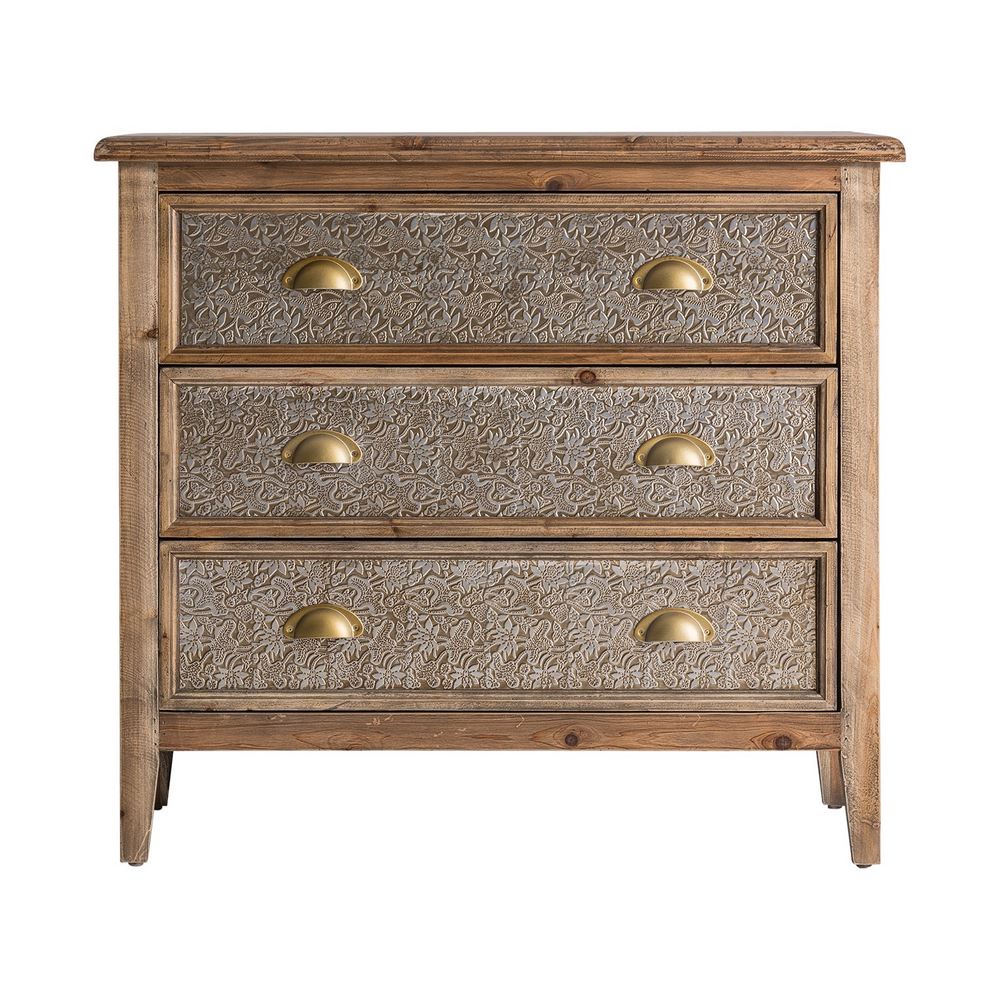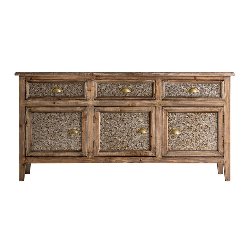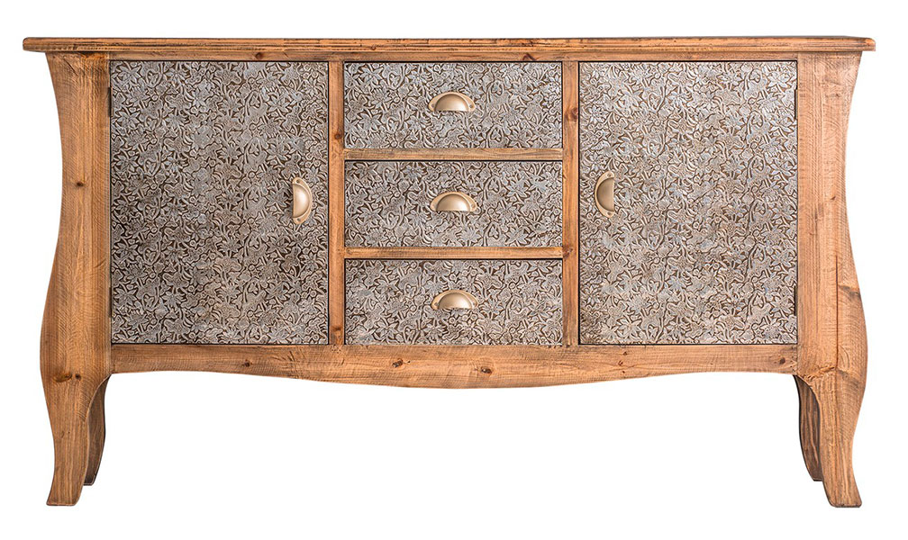 Para el primer post de este principio de año, os presentamos la nueva colección de muebles repujados serie Barney, esta colección dispone de 6 muebles fabricados con armazón en madera de abeto acabado rustico añejo, los cajones y puertas están forrados de aluminio repujado con motivos florales y acabado en oro decapado, disponemos en esta serie de 3 muebles aparadores, 1 mueble televisión para el salón, 1 mesita y 1 cómoda para el dormitorio, esta línea de mobiliario es muy original para decoraciones con estilos rústicos industriales, os adjuntamos las imágenes de los 6 modelos, para más información seguir los enlaces de texto al pie de cada imagen, recordar que en nuestros precios ya está incluido el IVA y los gastos de envió.