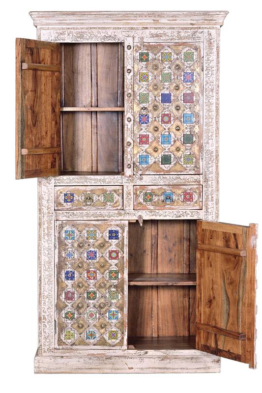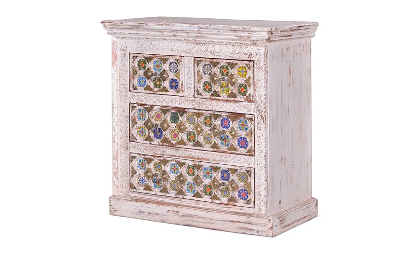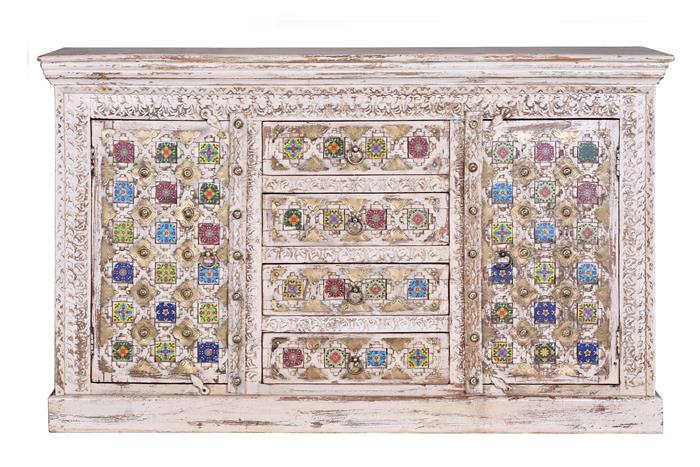 De nuestra sección en muebles orientales, esta semana hemos elegido para el post, la nueva colección Allegra, esta línea dispone de 6 muebles fabricados en madera de mango maciza, para su acabado se incrustan pequeñas cerámicas de colores en los tallados de la madera y decoraciones metálicas en color bronce, el resto está terminado en color blanco con un decapado rustico envejecido, os adjuntamos las imágenes de las 6 referencias, para más información podéis seguir los enlaces de texto a pie de cada imagen.