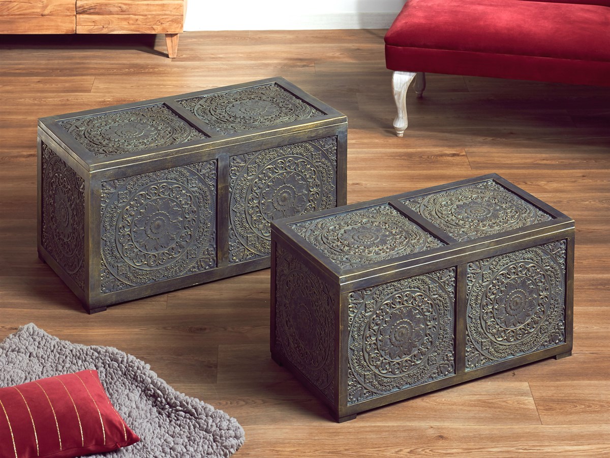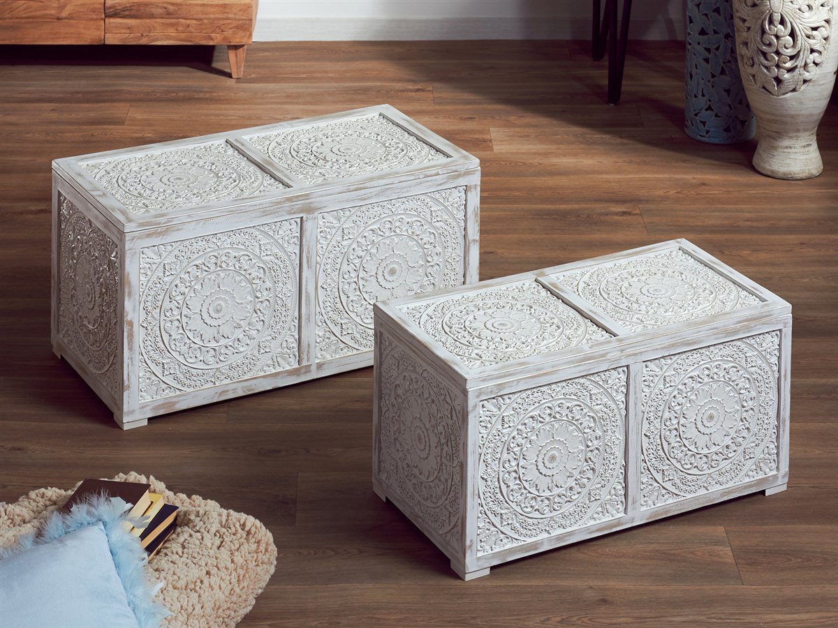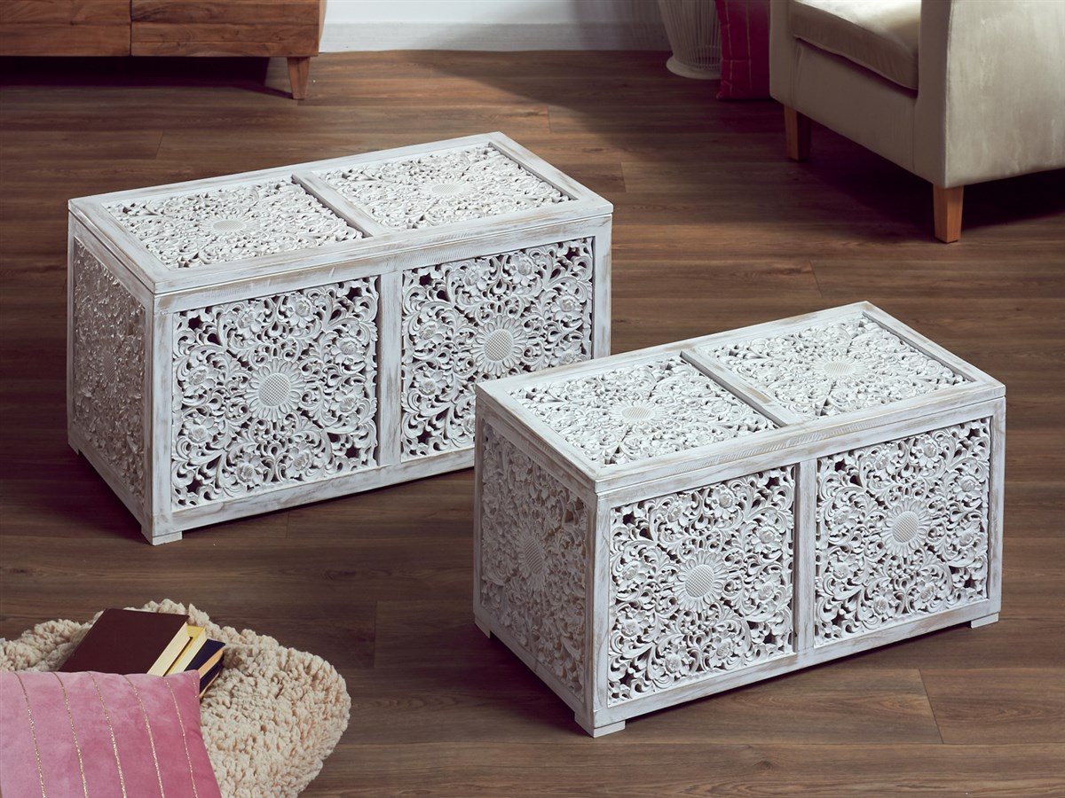 Para el post de esta semana, os presentamos la nueva colección de baúles y puff de la serie Ayoma, esta línea de baúles consta de 6 modelos que se fabrican con armazón en madera de abeto combinada con dfm tallado, para su acabado se lacan en color blanco decapado y oro viejo, esta colección de baúles son ideales para salones como mesas centro, dormitorios como jugueteros y puff, os adjuntamos las imágenes de los 6 modelos y los enlaces para que podáis ampliar la información, recordar en nuestros precios está incluido el IVA y los gastos de envió.